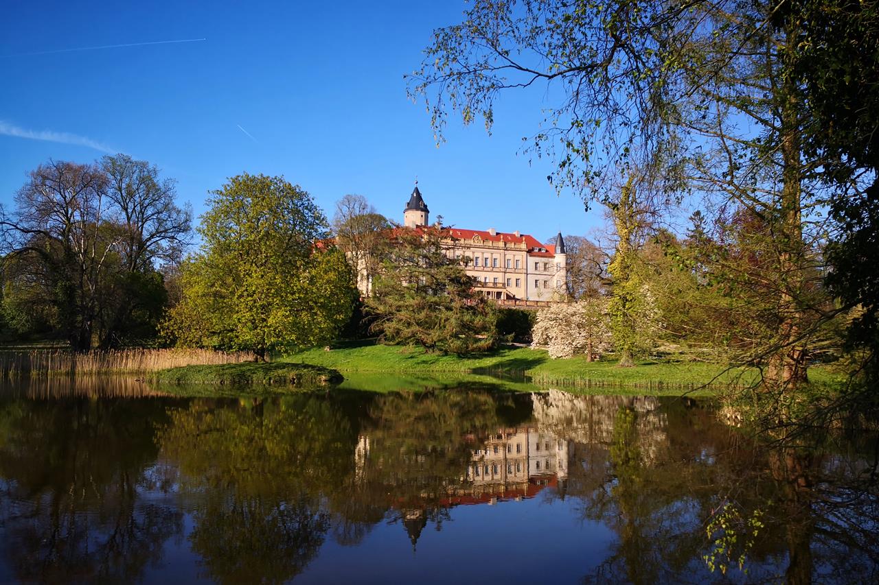 Blick über den Schlossweiher auf das Schloss Wiesenburg
