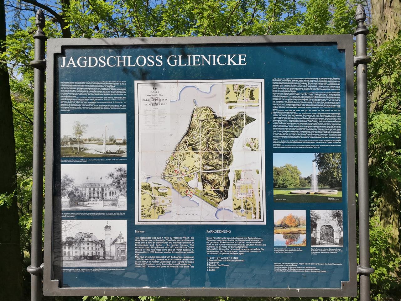 Infotafel am Jagdschloss Glienike mit Karte des Glieniker Parks