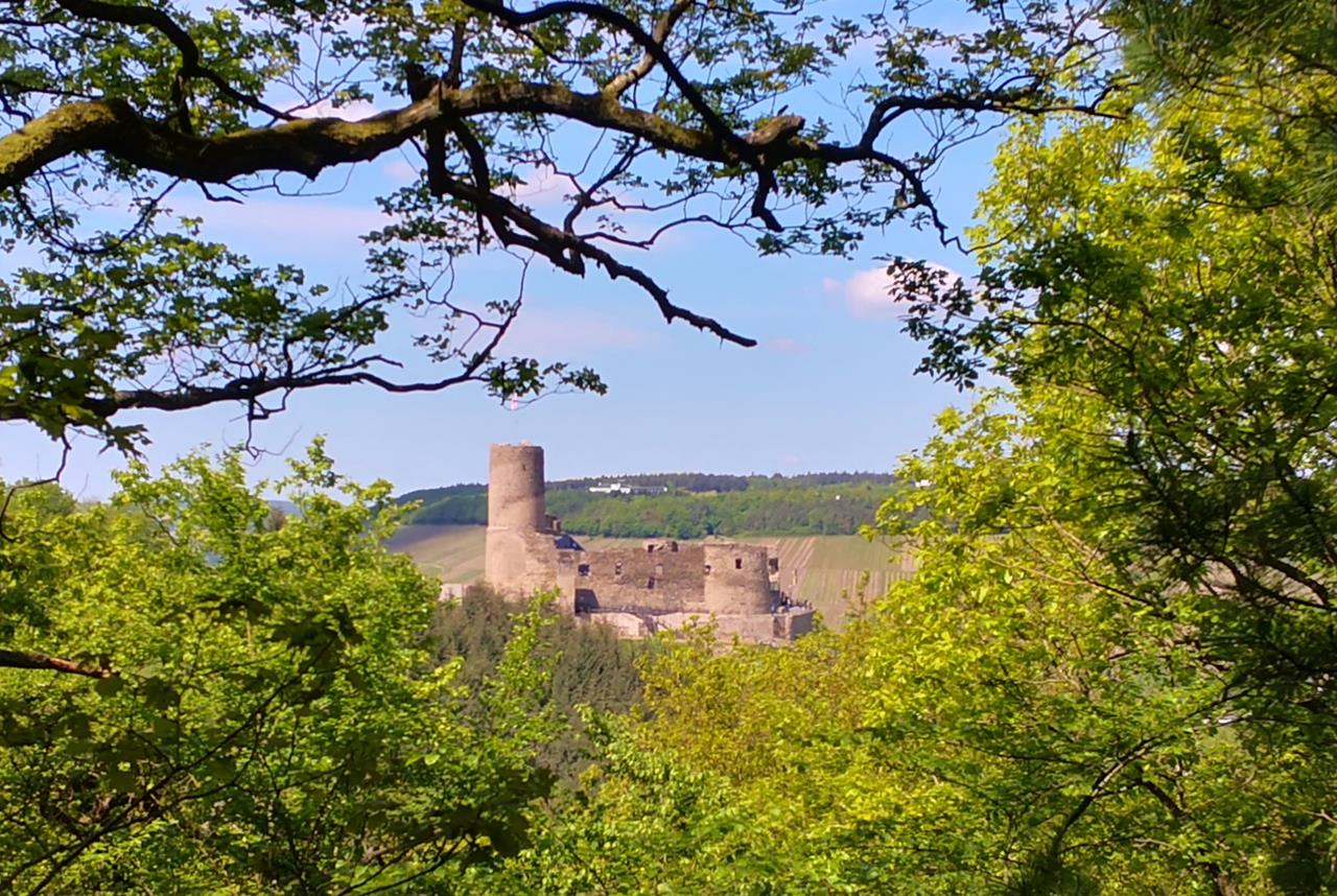Blick durch den Wald auf die Burg Landshut