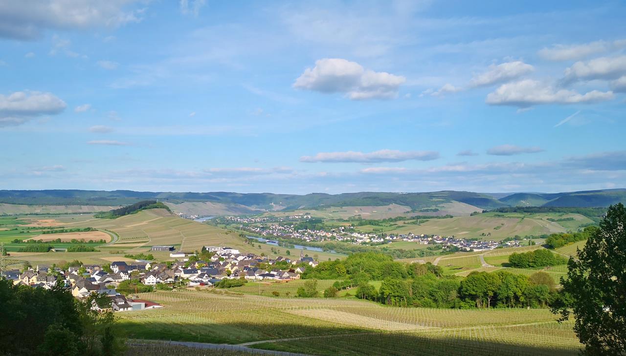 Blick oberhalb von Monzel in das Moseltal mit Bernkastel-Kues am Horizont