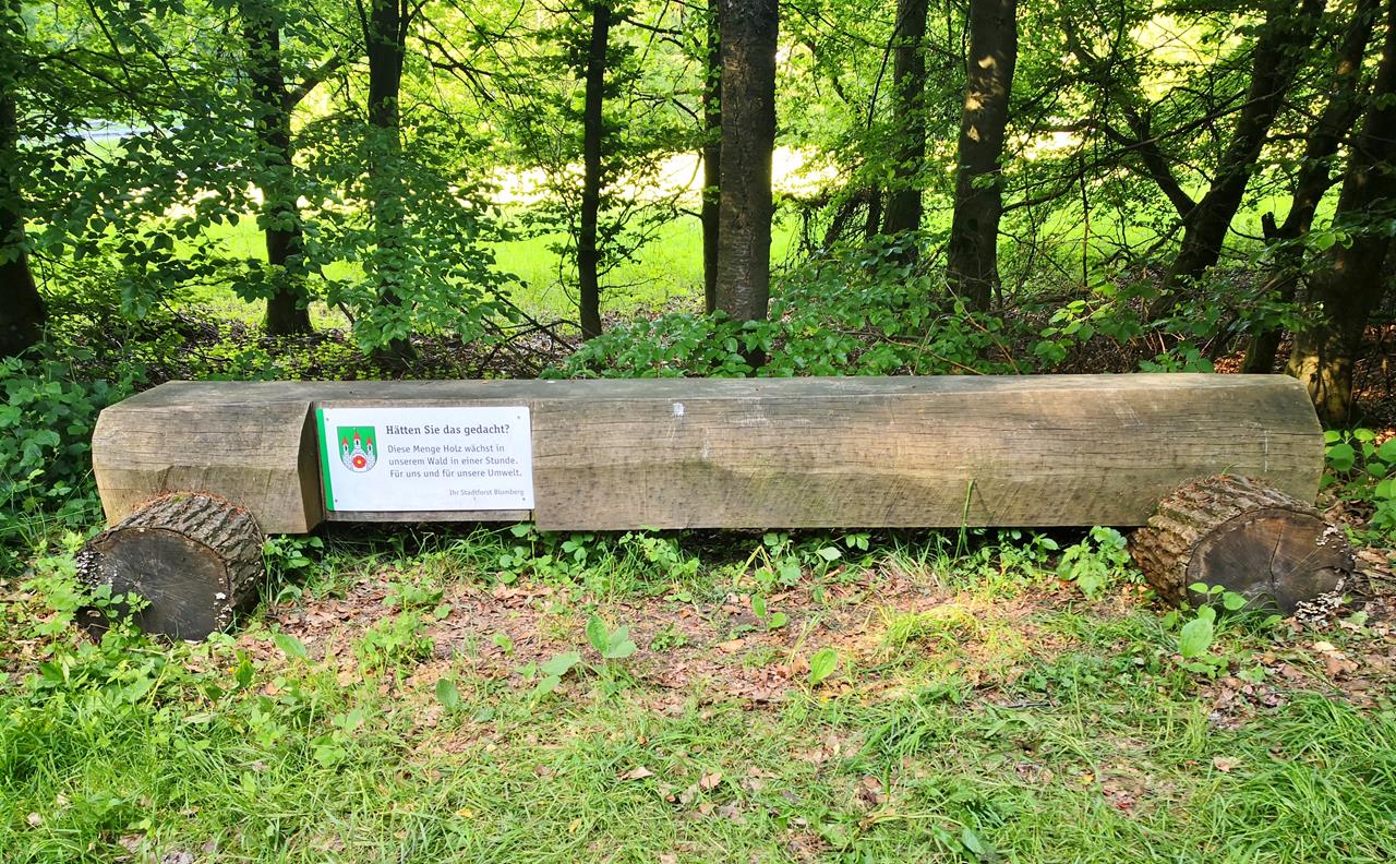 ← Zurück Weiter → Auf dem Schild steht zu lesen: So viel Holz wächst im Blomberger-Stadtwald innerhalb von einer Stunde nach.