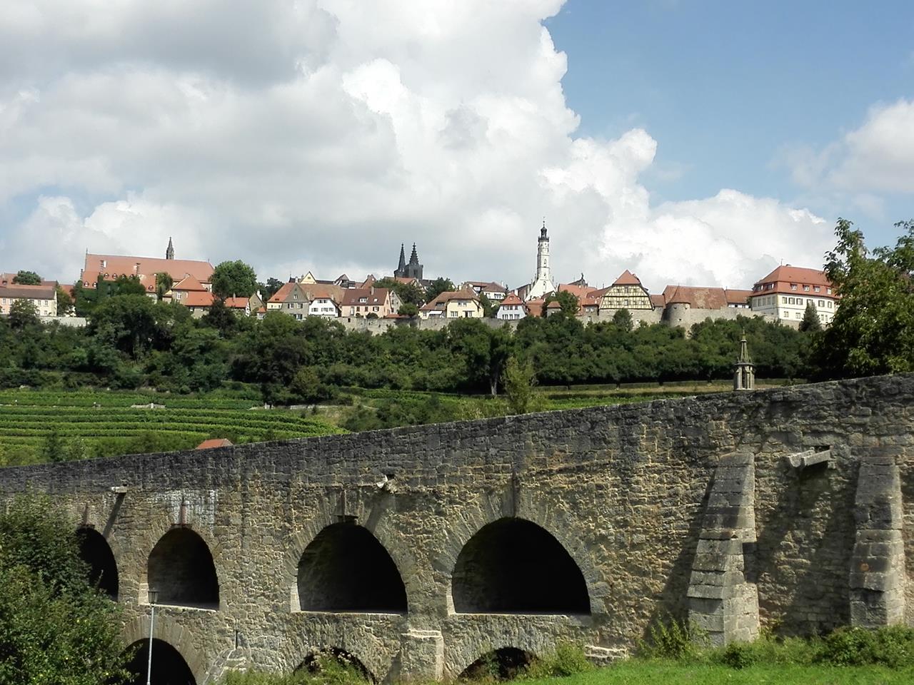Blick von der alten Tauberbrücke hinauf nach Rothenburg ob der Tauber