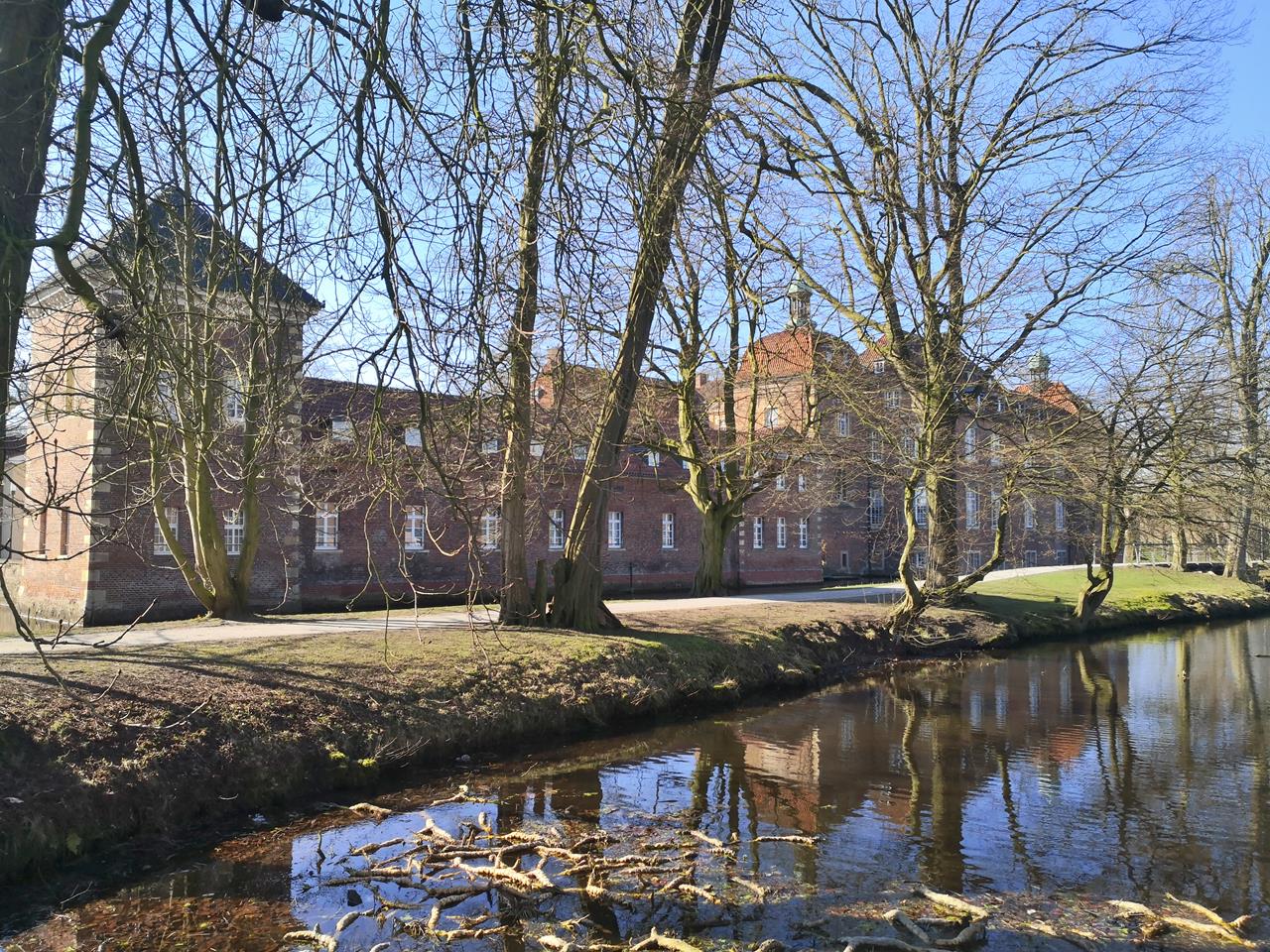 Seitlicher Blick auf Schloss Velen mit Wassergraben