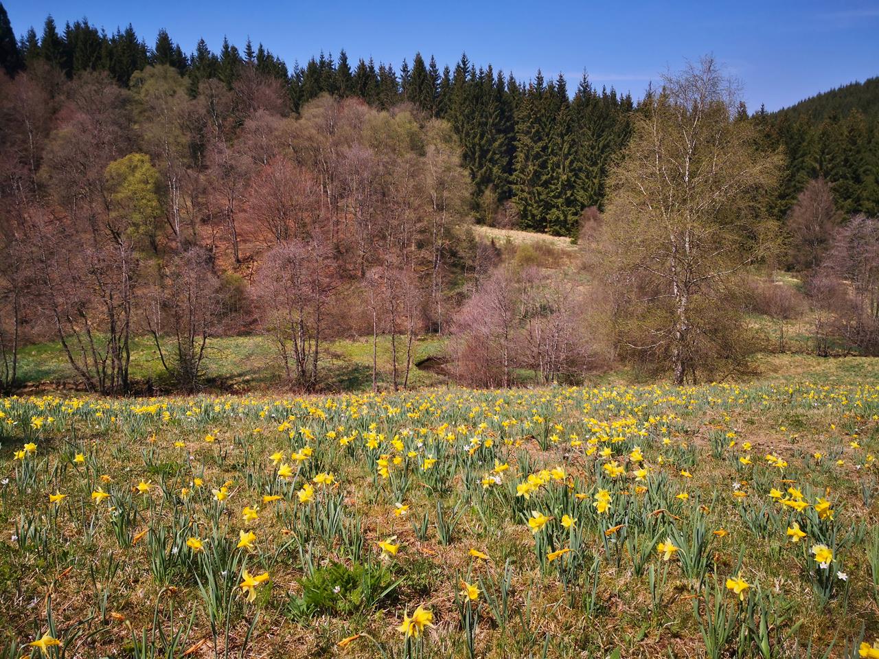 Wir wandern von einer Narzissenwiese zur nächsten
