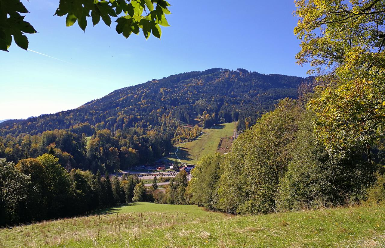 Blick auf den Skihang und die Sommerrrodelbahn am Wackersberg