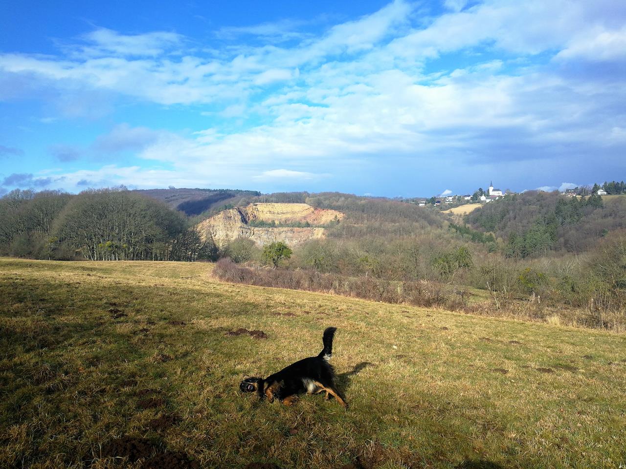 Blick zum Steinbruch im Eschweiler Tal. Doxi rollt sich auf der Wiese erste einmal ab.