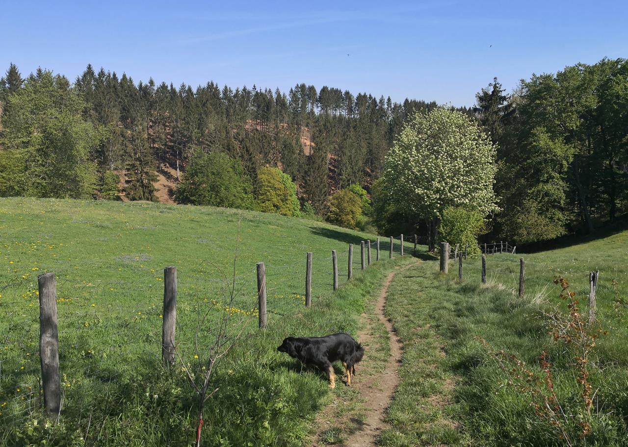 vossenack_mai_2020_006_1280x912 ← Zurück Weiter → Beim Abstieg ins Tal des Bosselbachs. Doxi nascht am frischen Gras.