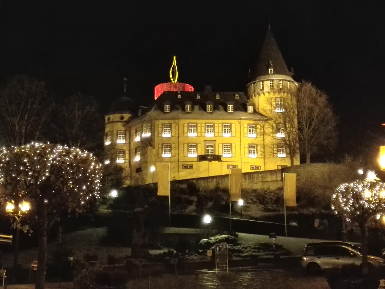 Die Genovevaburg in Mayen mit illuminiertem Bergfried