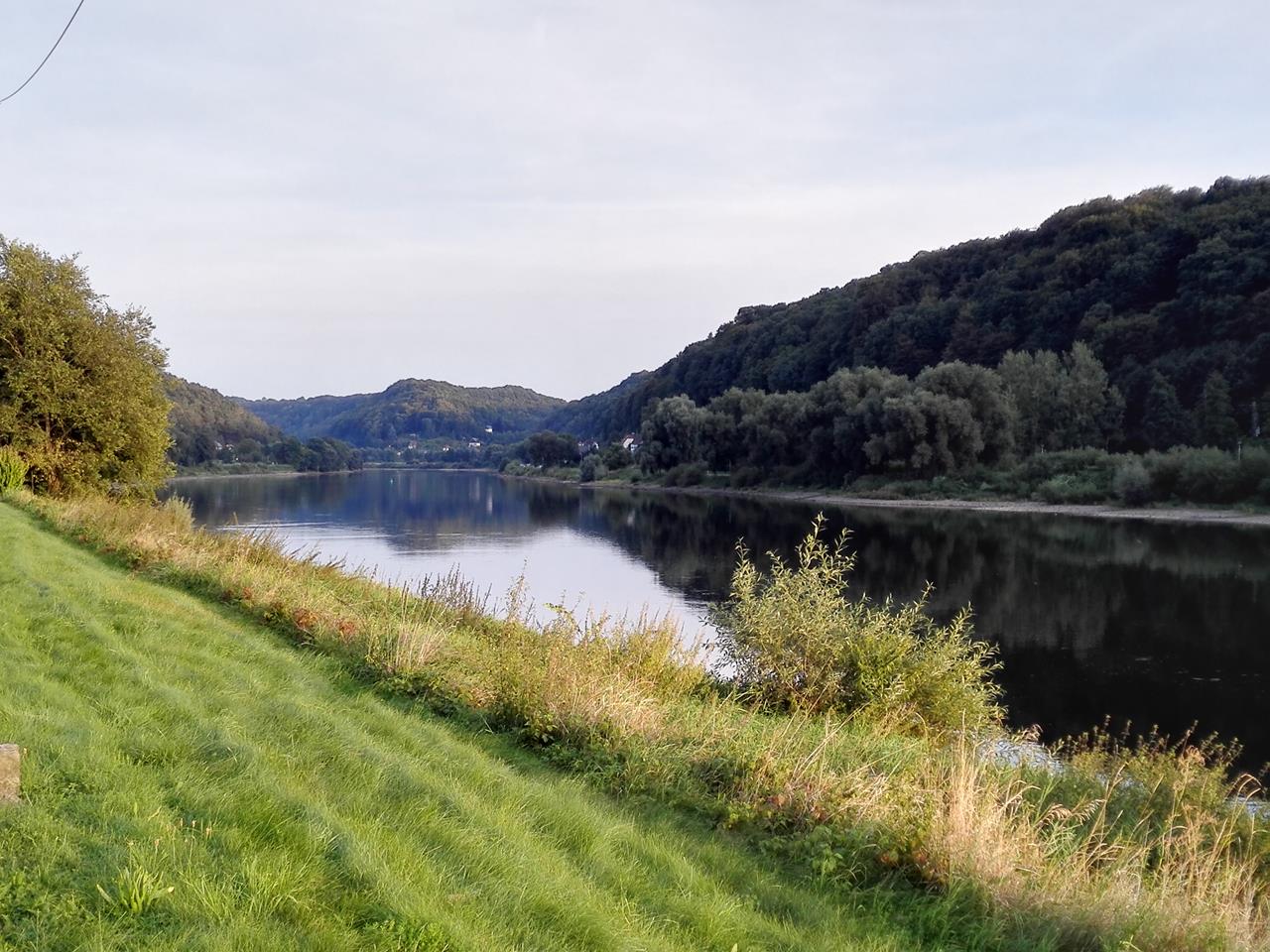 Weiter → Hier bricht die Elbe durch das Elbsandsteingebirge, dahinter weitet sich das Tal Richtung Dresden