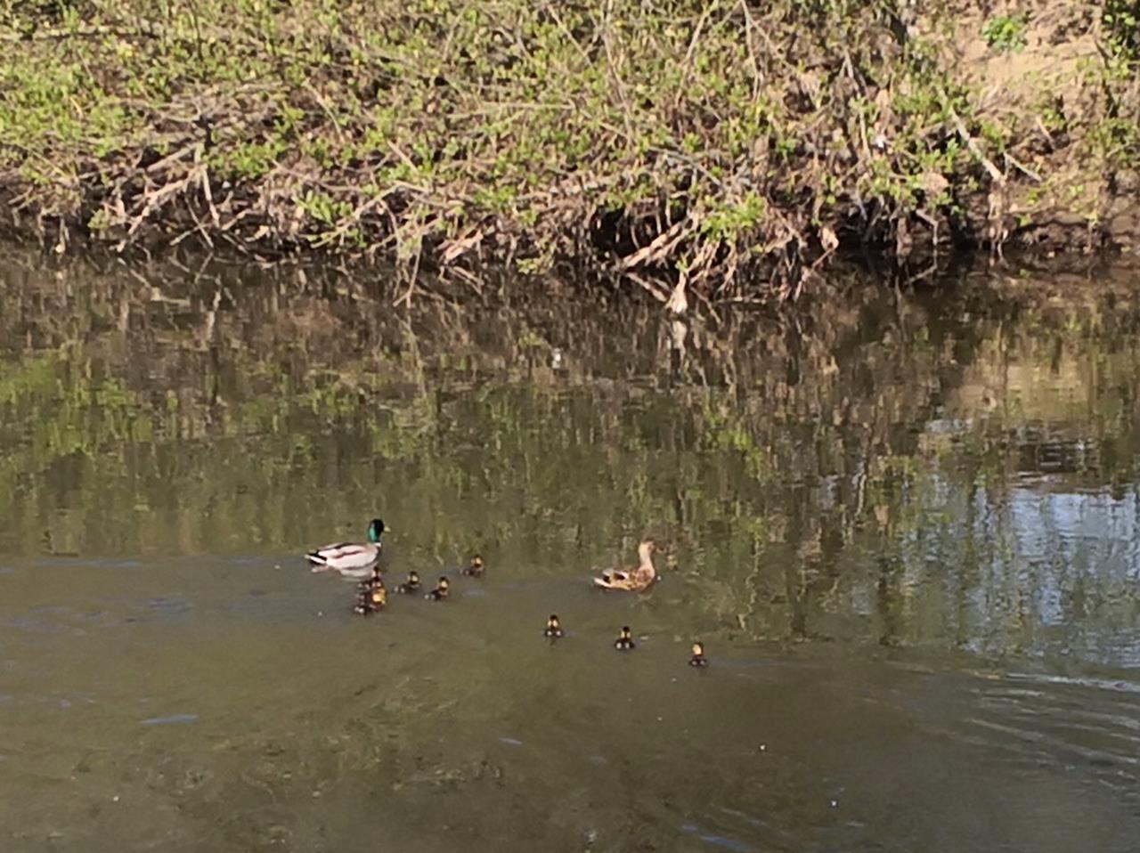 Eine Entenfamilie mit zehn Küken