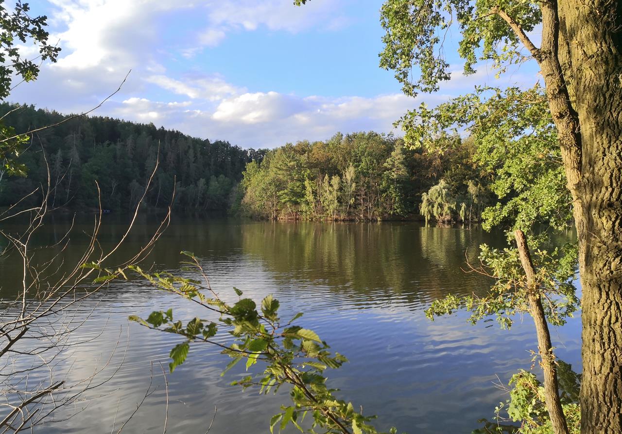 Blick auf die Insel in der Mitte des Stausees