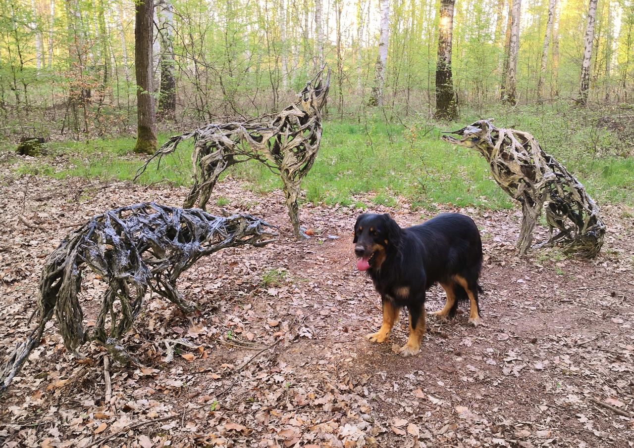 „Wölfe“, eine Skulptur von Marion Burghouwt aus dem Jahre 2010 im Wald außerhalb von Marienburg/Mark