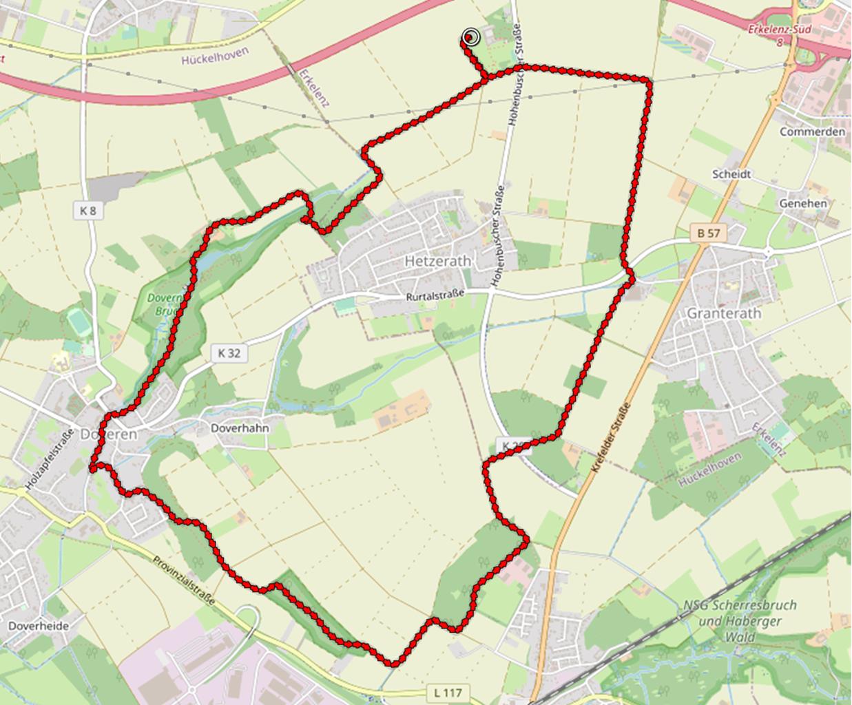 Die Landschaft, 40 km westlich von uns, ist nicht komplett flach, sondern von kleinen Taleinschnitten durchzogen, in denen sich Bäche in den Waldgrund gegraben haben.Wir wandern in einer Schleife durch Feldflächen und kleine Waldgebiete am Rand der Dörfer Hetzerath, Doveren, Baal und Granterath.