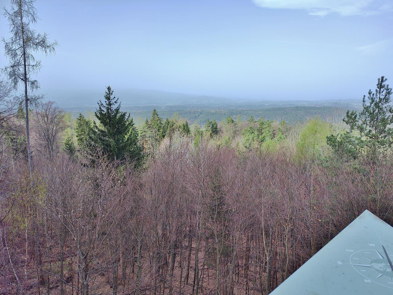 Es geht steil hinauf durch den Wald auf teils rutschigen Pfaden. Unterhalb des Buchkogels erwartet uns ein Aussichtspunkt in Richtung Westen und oben auf der Bergspitze einen kleinen Aussichtsturm mit Blick in Richtung Osten hinunter nach Graz. Doch in beiden Fällen ist leider nicht so wahnsinnig viel zu sehen.