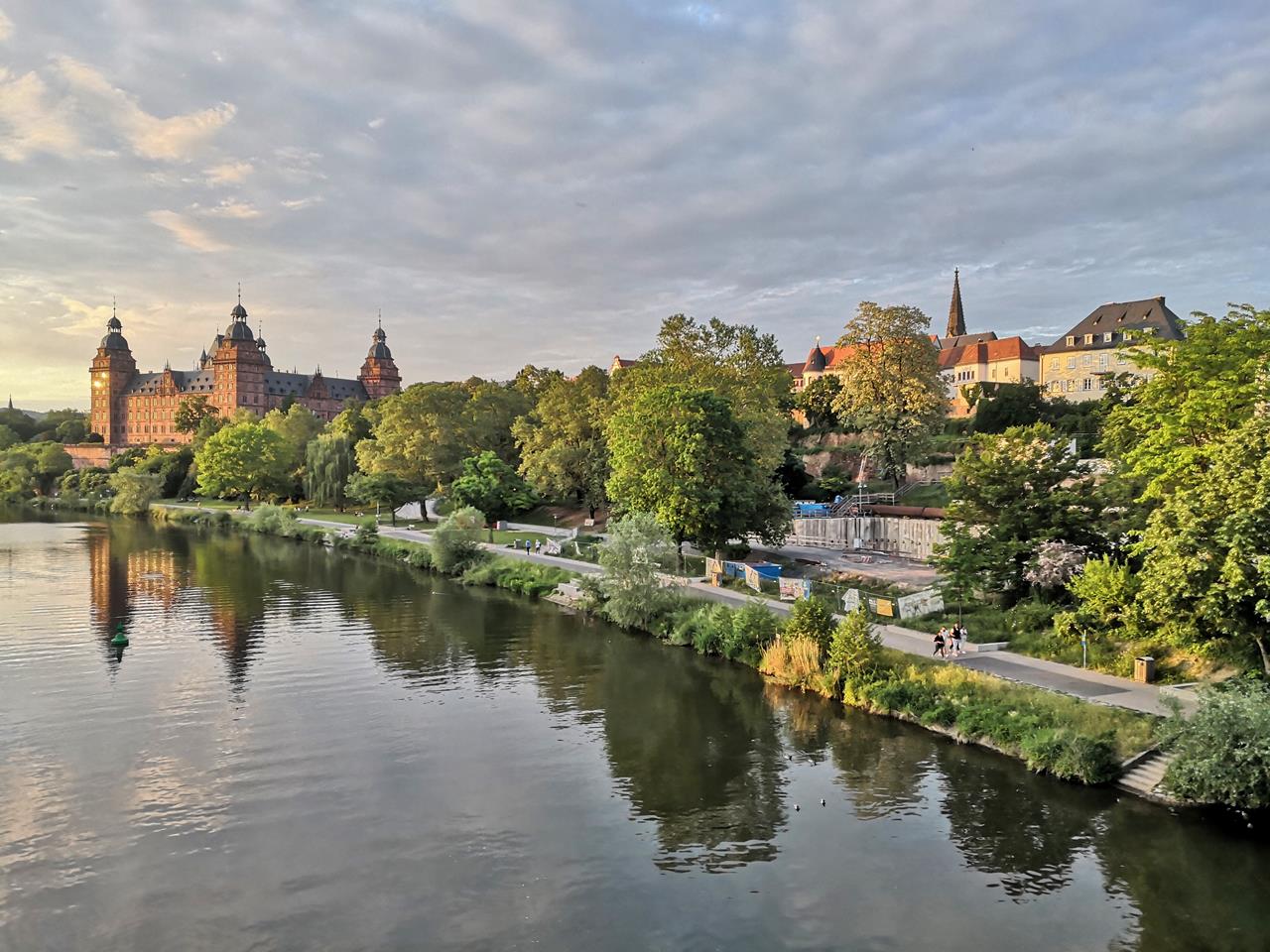 gegenüber der Altstadt. Von der Brücke hat man einen tollen Blick auf das Schloss Johannisburg, dem Wahrzeichen von Aschaffenburg am Rande der Altstadt.