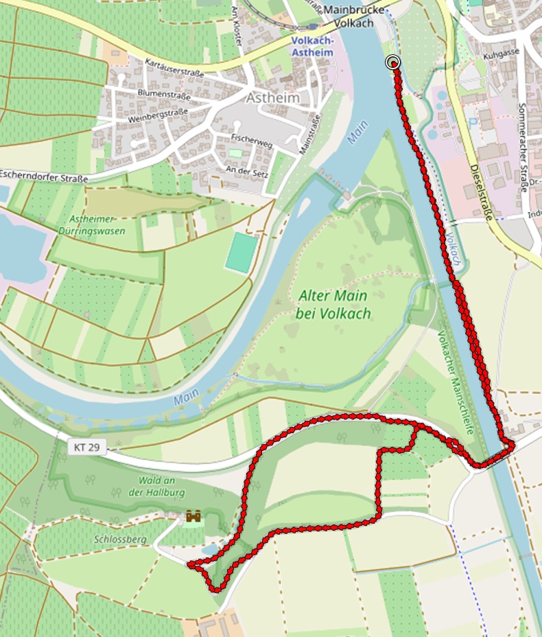 Am liebsten würde ich mit Doxi zum höchsten Punkt der Weininsel laufen, wo es in den Weinbergen einen Aussichtsturm mit fantastischem Blick über die gesamte Mainschleife geben soll. Aber das ist für meine alte Dame deutlich zu weit.Also begnüge ich mich mit einer kleinen 6-km-Wanderung von unserem Stellplatz bei Volkach zum Weingut Schloss Hallburg am nordöstlichen Rand der Maininsel. Nur weil es südlich von unserem Stellplatz am Ortsrand von Volkach eine von drei Brücken zur Weininsel gibt, ist das überhaupt möglich.
