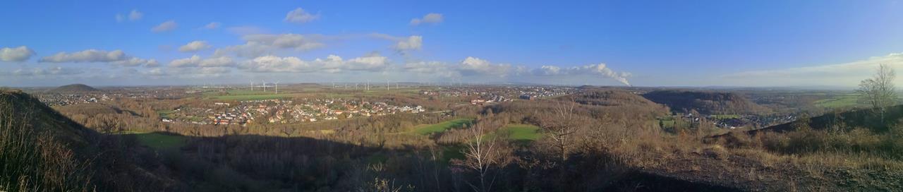 Irgendwann treffen wir aber doch auf einen Weg, der offensichtlich auch von Mountainbikern genutzt wird, und uns geradewegs zur Spitze der Halde führt. Oben haben wir bei herrlichem Sonnenschein einen fantastischen Fernblick in alle vier Himmelsrichtungen.