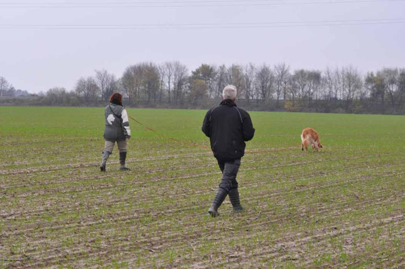 Es waren insgesamt sieben suchstarke Teams am Start. Ich zog bei der Auslosung die Nummer 1. Das Gelände war keine so große Herausforderung für Bellis, da die Schritte des Fährtenlegers auf dem Acker gut auszumachen waren.