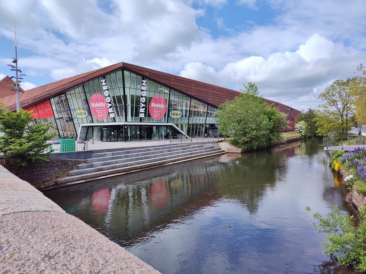 Alte Architektur im Zentrum von Vejle trifft auf neue und moderne Wohnbebauung im Hafen. Ähnlich wie in Aarhus, nicht ganz so raumgreifend zwar, aber architektonisch durchaus spektakulär.Im Hintergrund die große Autobahnbrücke über den Vejlefjord. Bis zu ihrer Errichtung 1980 floss ein großer Teil des Nord-Süd-Straßenverkehrs in Jütland durch Vejle, was die Stadt sehr belastete.