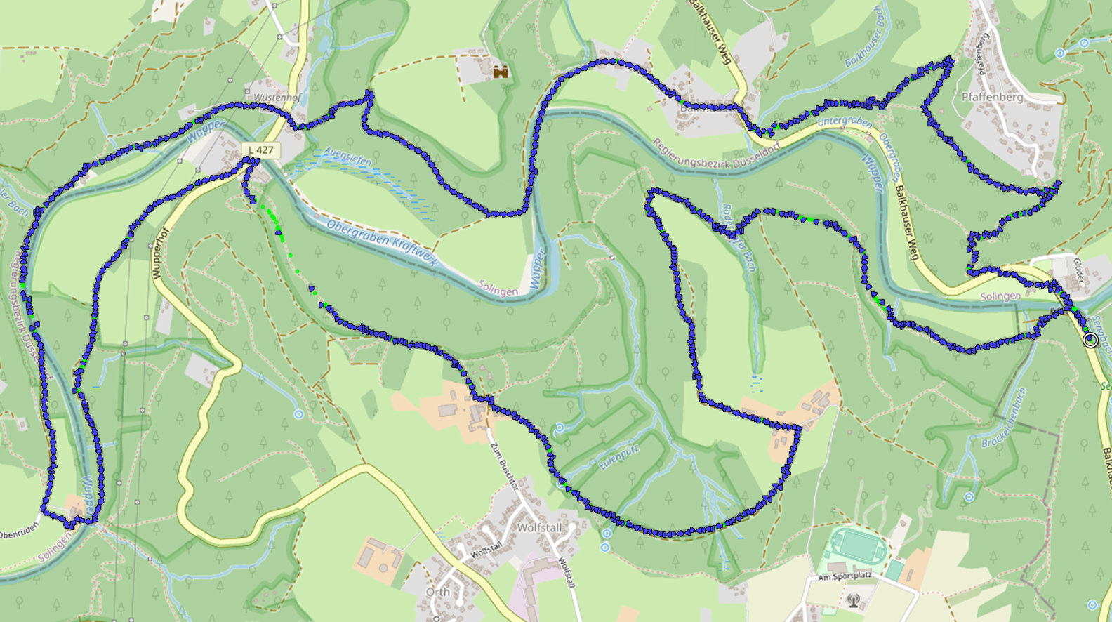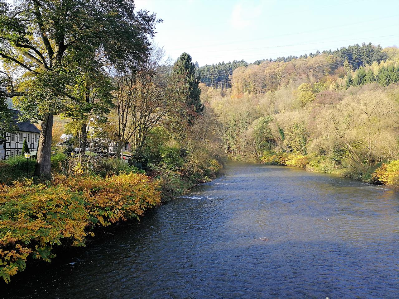 Durch flaches Gelände folgten wir anschließend der Wupper in südlicher Richtung und überquerten den Fluss auf der Hälfte der Wanderstrecke bei Rüdenstein. Nun ging es auf der anderen Flussseite in nordöstlicher Richtung zurück.Nach einigen Kilometern erreichten wir den Pfaffenberg und kamen am Balkhauser Kotten vorbei, einem von zwei weitgehend im Original erhaltenen Schleifkotten an der Wupper im Bereich der Stadt Solingen.