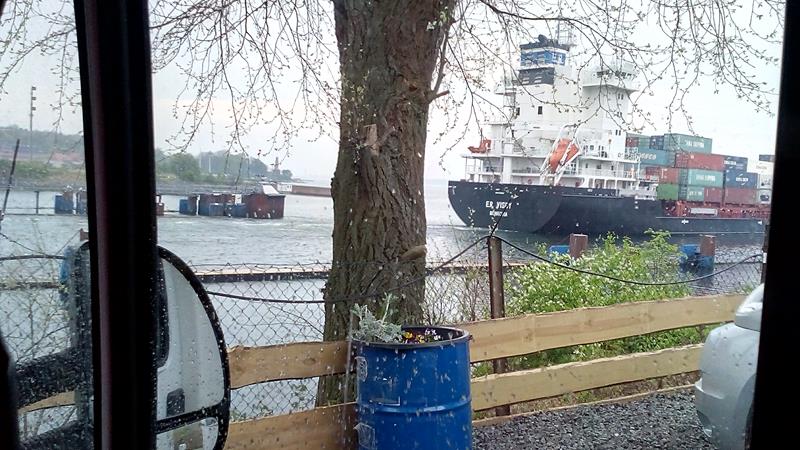 Im Verlauf des Tages passieren bis zu einhundert Schiffe die Schleuse, und sie alle laufen freundlicherweise direkt vor unserem Womo-Fenster vorbei.