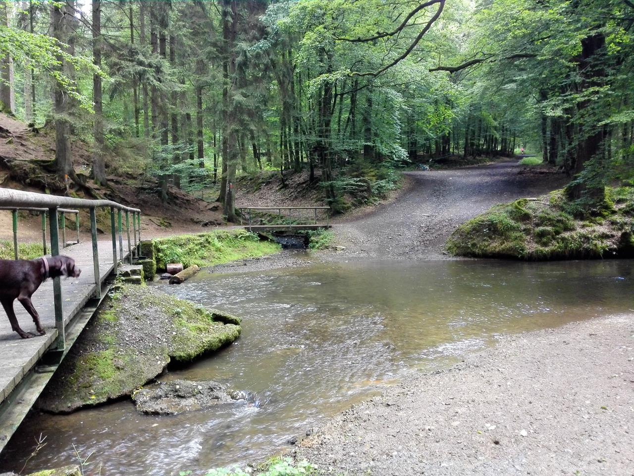 Wir folgten dabei der 16 km langen Tour 13 aus dem Rother-Wanderführer „Bergisches Land“.Mit von der Partie: Die beiden Hunde Doxi und Donna, die unheimlich viel Spaß in den zahlreichen Wasserstellen entlang des schönen Weges hatten.