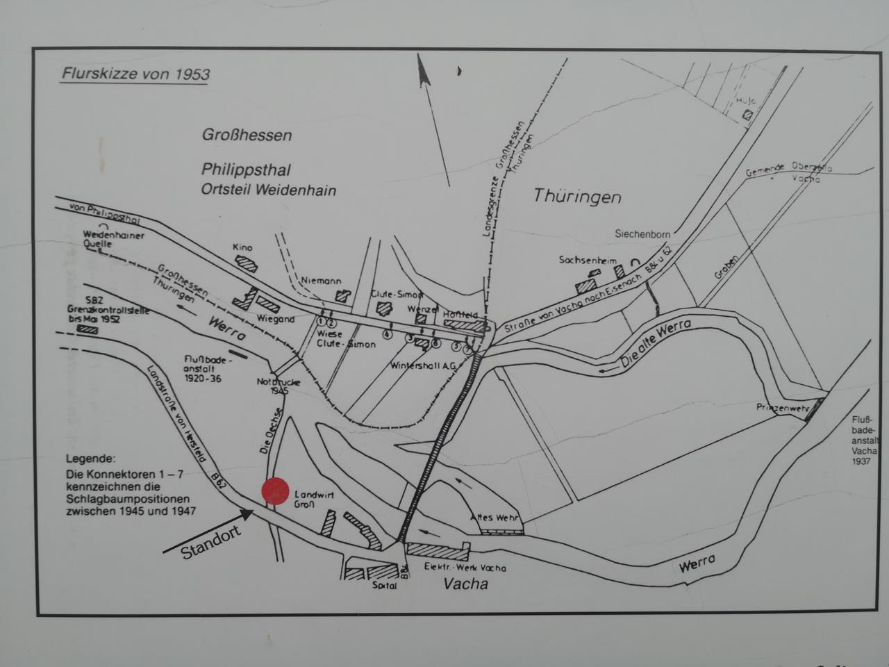 Vielfach konnten die Menschen aus ihren Häusern am Fluss oder etwas oberhalb direkt auf die andere Seite blicken – und diese doch niemals erreichen.Zwischen Vacha und Philipstal führte die steinerne Werra-Brücke, Teil des uralten Handelsweges zwischen den Messestädten Frankfurt und Leipzig, über den Fluss.