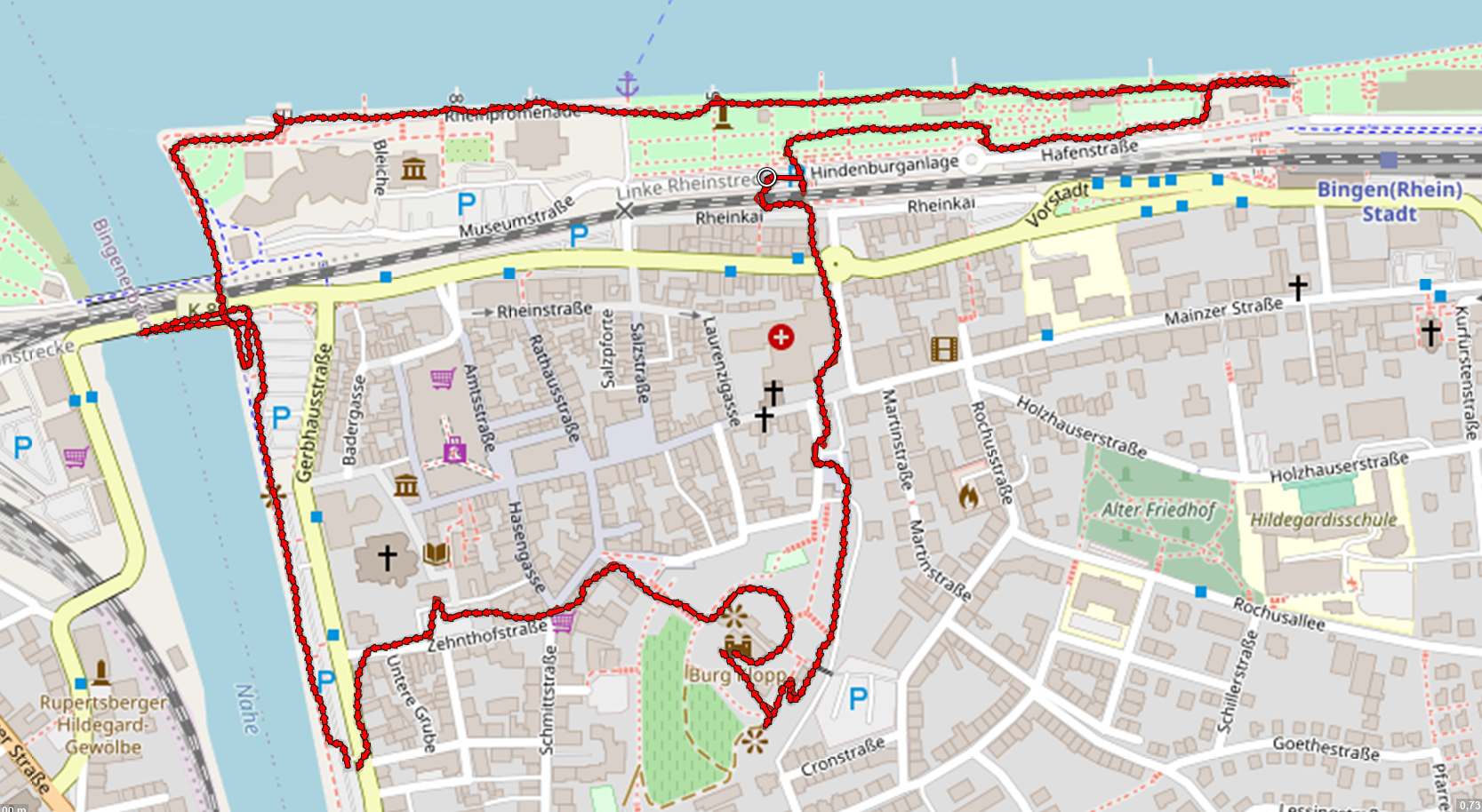 Mit Doxi laufe ich ein Stück an der Rheinpromenade stromaufwärts. Anschließend steigen wir durch das Ortszentrum von Bingen zur Burg Klopp auf, in der heute die Stadtverwaltung residiert. Von dort haben wir noch einmal einen herrlichen Panoramablick auf die Nahemündung und den Rhein.