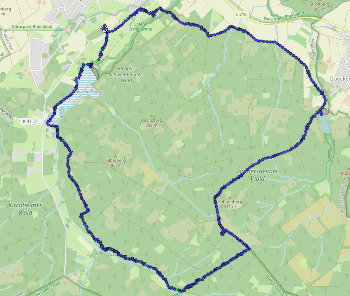 Auf matschigen Pfaden geht es stetig aufwärts, bis wir auf halber Strecke am Hahnenberg den höchsten Punkt unserer Wanderung erreichen. Nun beginnt unser Abstieg zur Madbachtalsperre am Waldrand kurz vor Queckenberg.