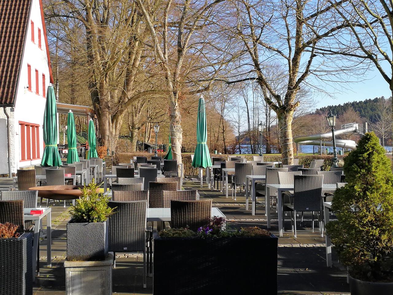 Wir laufen zunächst am Rand der Talsperre entlang, passieren das Waldfreibad und die zurzeit noch geschlossene Waldschänke und biegen dann in den Kloster Schweinheimer Wald ein.