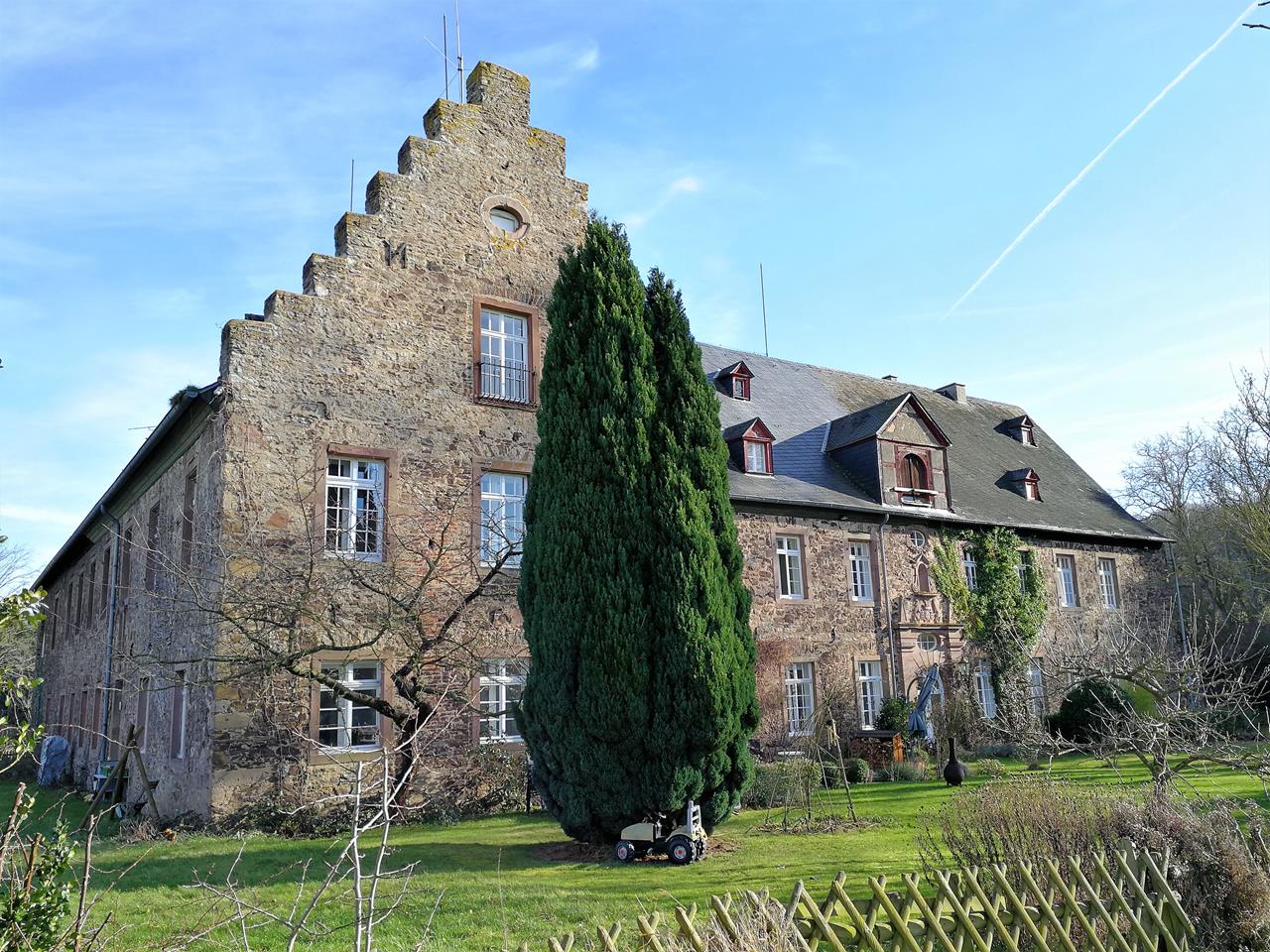 Von dort geht es weiter am Rande des Waldes entlang des Madbachs, bis wir auf das ehemalige Kloster Schweinheim treffen, nach dem der Wald benannt ist. Die frühere Zisterzienserabtei bestand von 1238 bis 1802 und stand unter der geistlichen Leitung des Klosters Heisterbach. Nach ihrer Schließung wurde die Kirche niedergerissen. In den verbliebenen Gebäudeteilen befindet sich heute ein Seminarhaus.