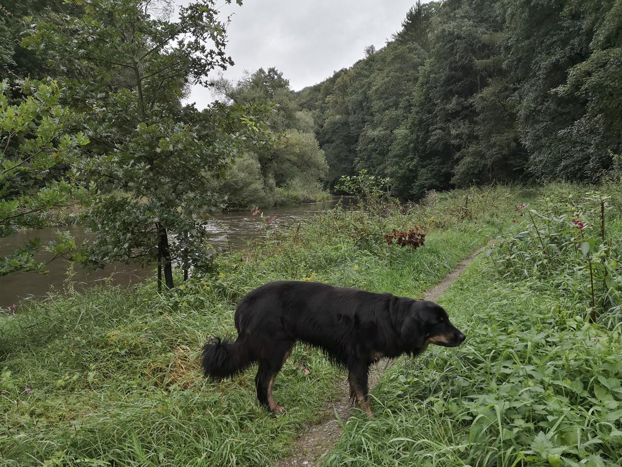 Nach dem Dauerregen der letzten 24 Stunden führt die Elster viel Wasser. Wild rauschend zieht der Fluss an uns vorbei und schwappt an einigen Stellen bis auf wenige Zentimeter an den Wanderpfad heran.