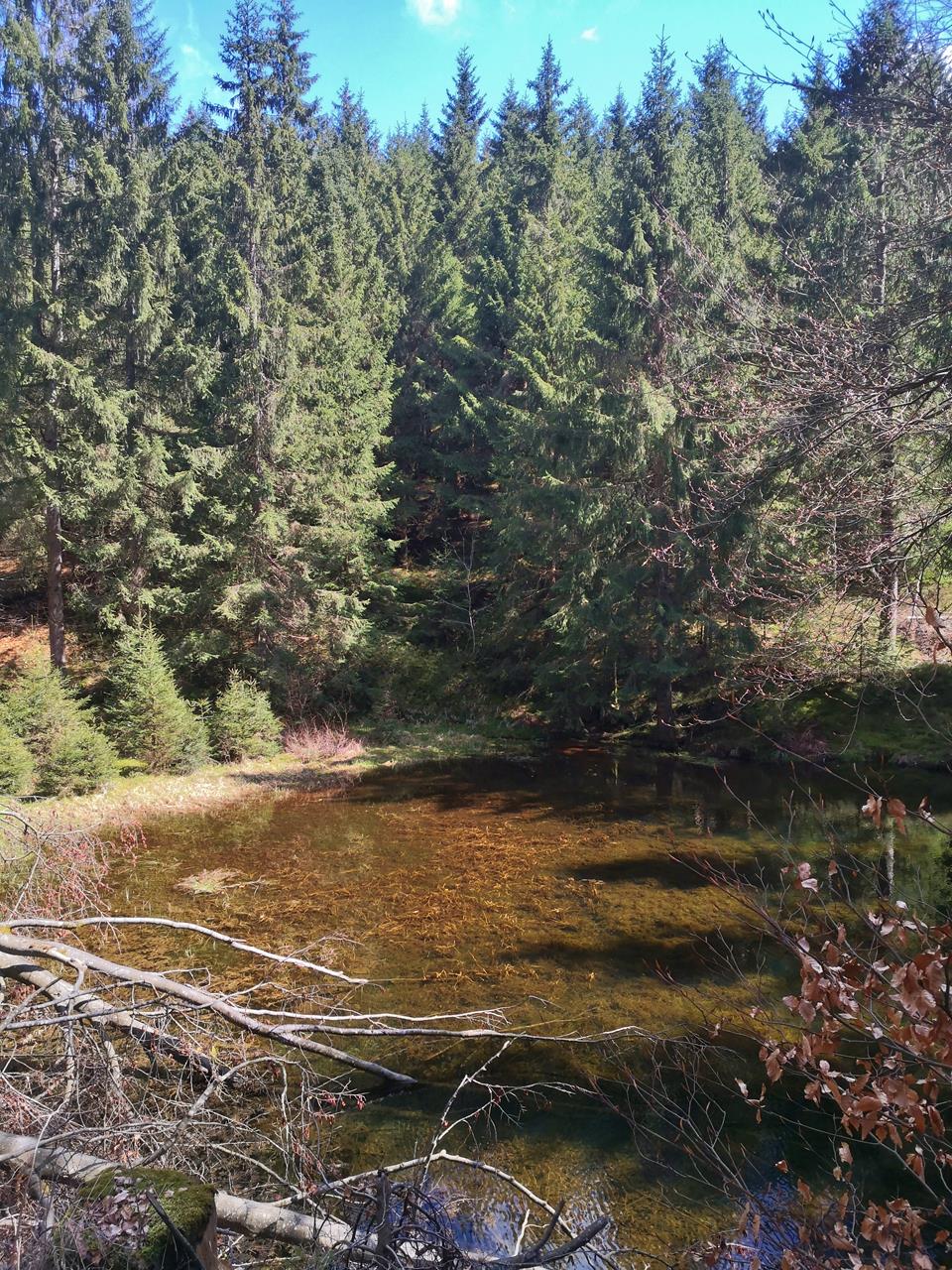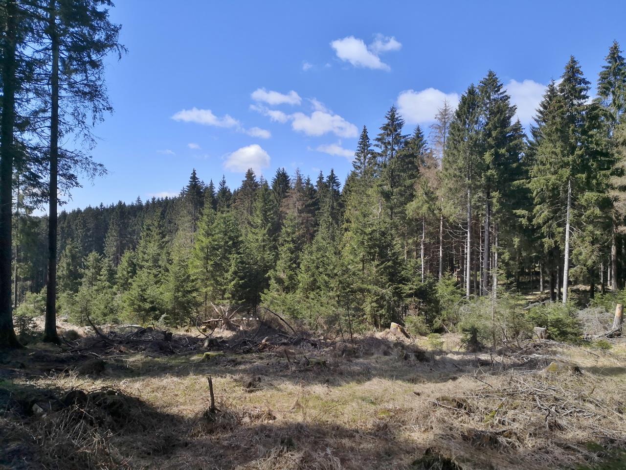 Es geht durch schöne Natur, und hier auf fast 800 Meter Höhe ü.N.N. macht der Fichtenwald auch noch einen relativ gesunden Eindruck.Vor allem sieht man, wie wasserreich die Höhen sind. Von überall her strömen kleinen Wasserläufe in Richtung Tal, vereinigen sich und plätschern munter dahin. Auch die noch junge Werra gehört dazu, die hier entspringt.