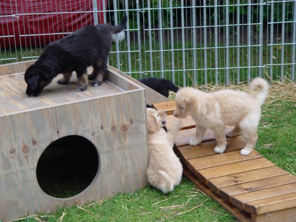 Am Anfang haben sie sich noch todesmutig in die Tiefe gestürzt, doch mittlerweile benutzen sie die Stiege für den sicheren Abstieg. Ganz neu im Welpenauslauf: Ein Spielbecken mit Plastikbällen. Das wurde von den Welpen sogleich erobert.