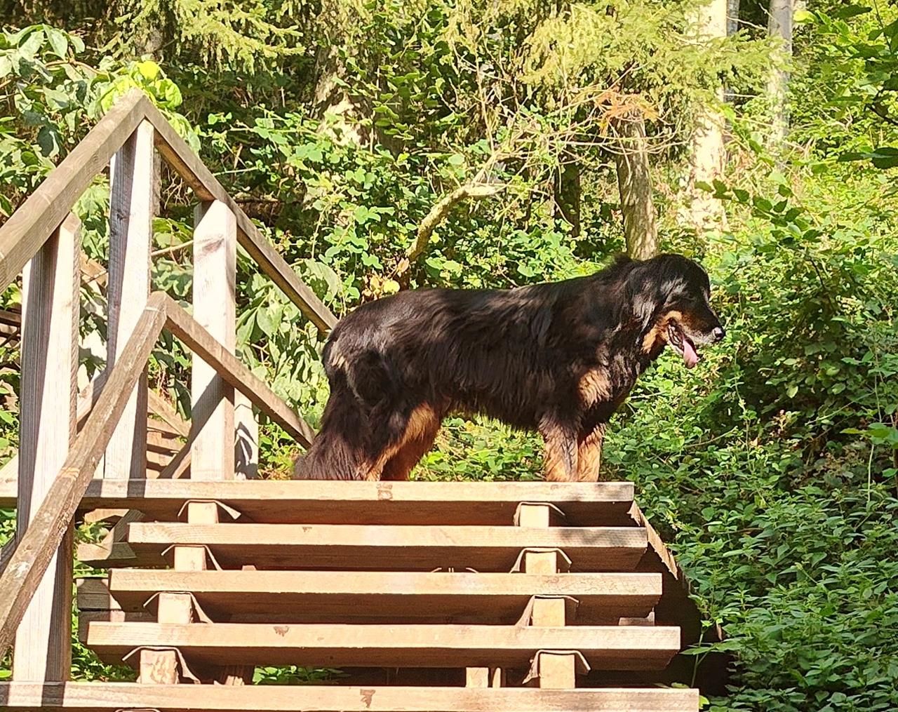 Ich bin ein wenig stolz auf meine Doxi, dass sie die 15 km lange Strecke mit mehreren steilen Anstiegen und 260 Höhenmetern in ihrem zwölften Lebensjahr noch so fein bewältigt hat. Die alte Dame ist einfach noch gut im Training – toi, toi, toi.