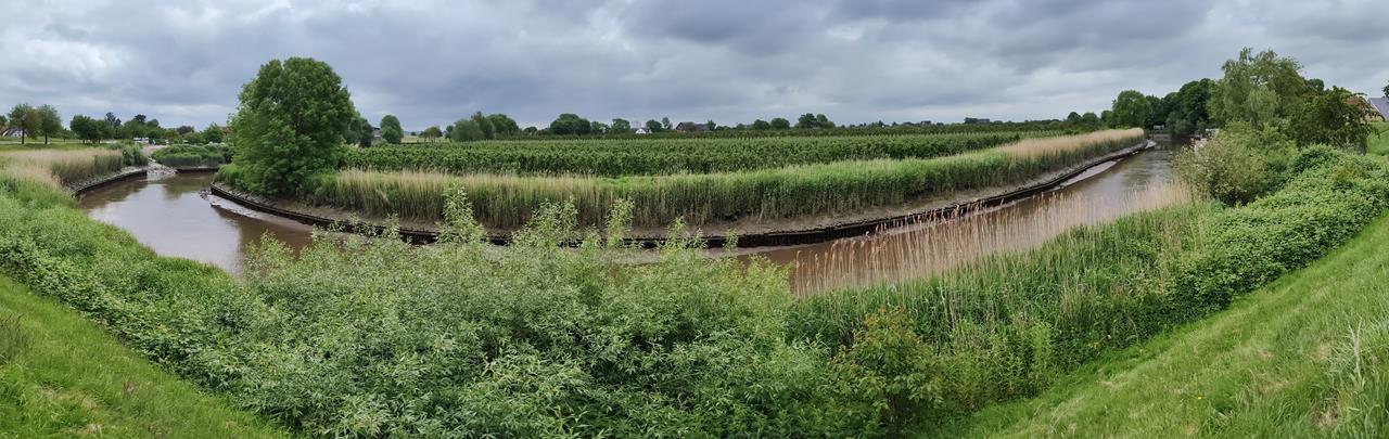 Vom leicht erhöhten Damm aus können wir immer wieder weite Blicke in das Land werfen, in dem sich ein Obstbaum an den anderen reiht.