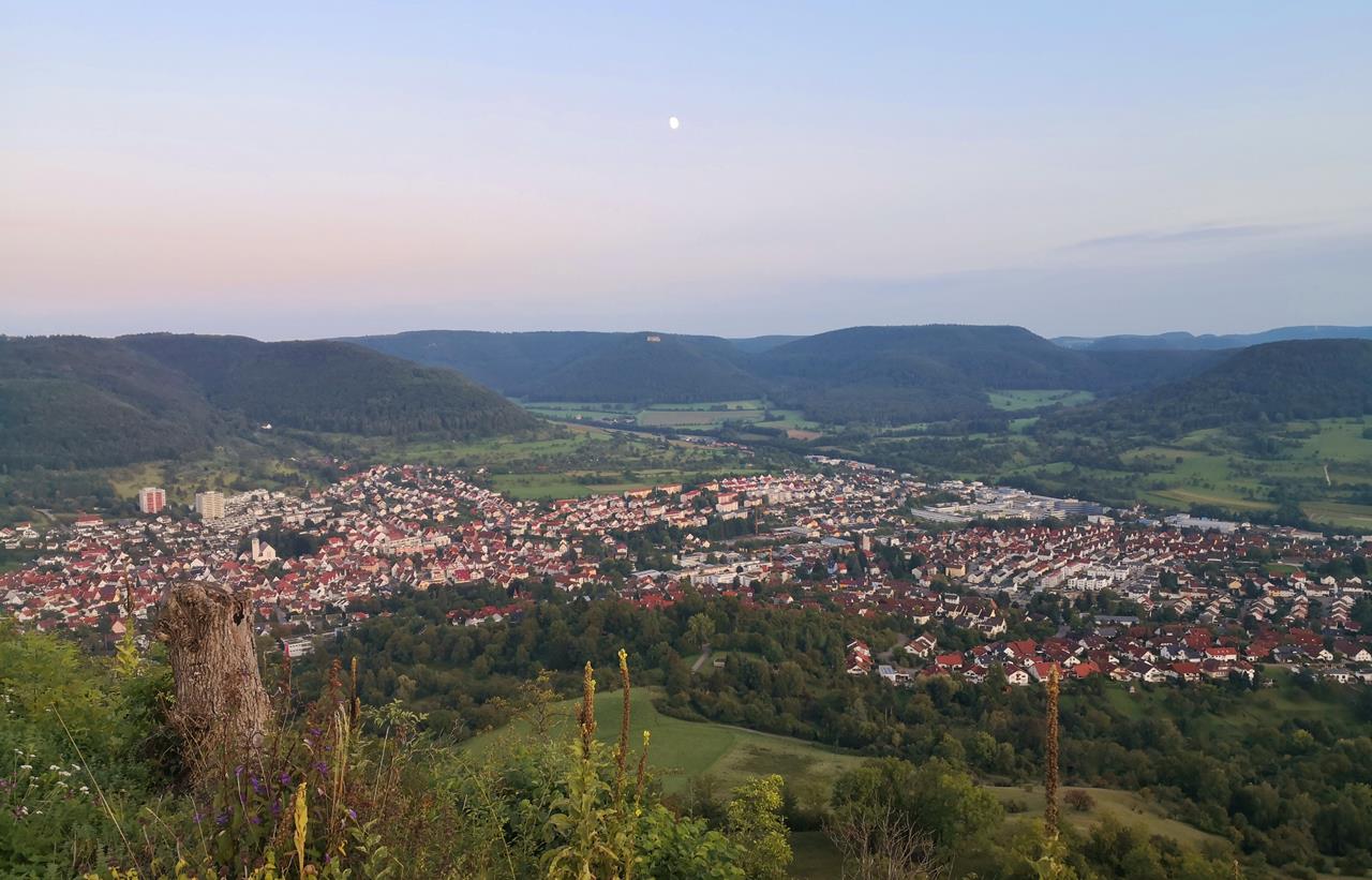 Auf halber Höhe passieren wir das beliebte Achalm-Wirtshaus und -Hotel, bevor es in einer Umrundung des Berges hinauf zur Spitze geht. Dort steht noch der Bergfried einer im 11. Jahrhundert erbauten Höhenburg. In der bereits untergehenden Sonne können wir weite Blicke hinunter auf Reutlingen und die Reutlinger Alb genießen.