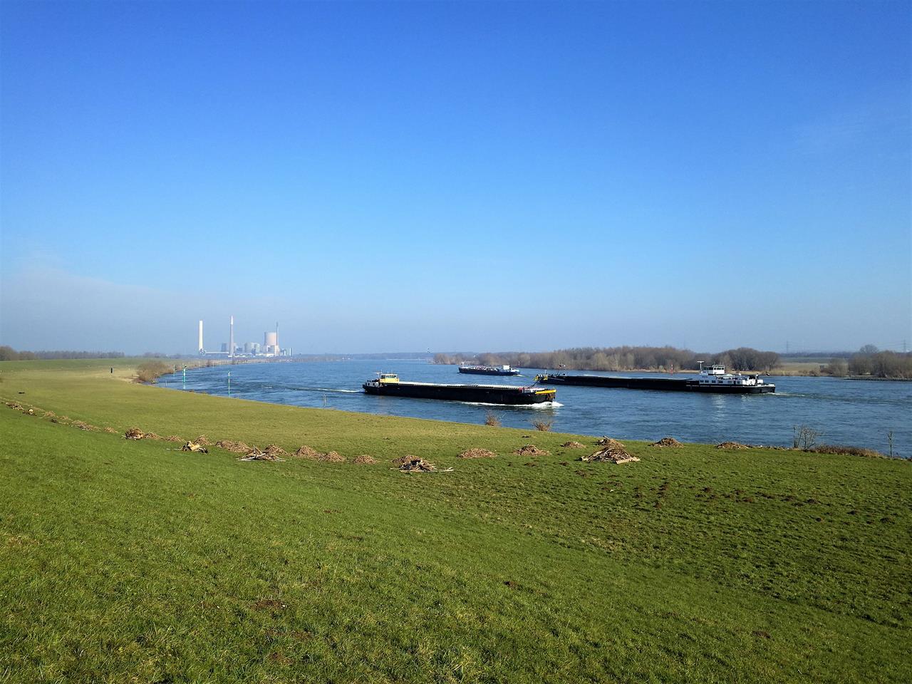 Wir laufen in nördlicher Richtung auf das 2017 stillgelegte Kohlekraftwerk Voerde zu. Die Landschaft wird vom Wasser und von Wiesen geprägt, doch am Horizont sind auch zahlreiche Industrieanlagen sichtbar.Dazu die schwer beladenen Frachtschiffe, die sich stampfend mit und gegen die Rheinströmung vorwärts schieben – eine interessante Mischung ist das.