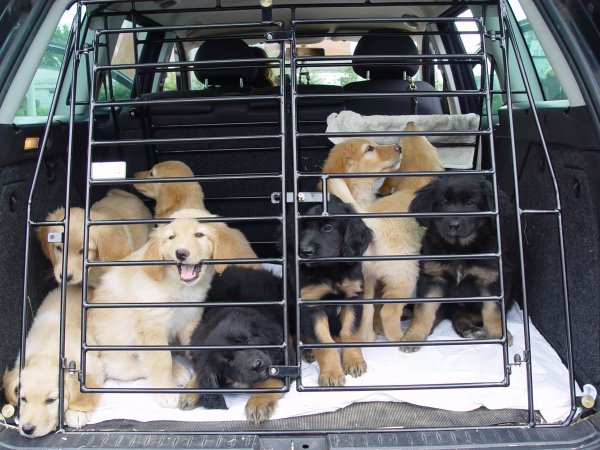 Wir sind im Auto unterwegs nach Düsseldorf zu einer befreundeten Tierärztin. Die Welpen im Heck des Kombi bekommen sich nicht mehr ein, schreien die ganze Fahrt. Wahnsinn.