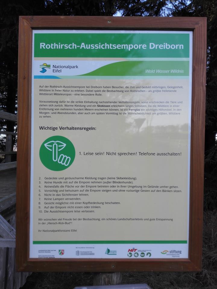 Wir parken am Wanderparkplatz bei der Hirschempore am nördlichen Ortsausgang von Dreiborn. Von der Hirschempore hat man einen wunderbaren Blick über die Hochfläche und kann vor allem während der Brunftzeit im Oktober zahlreiche Hirsche beobachten, die auf der Hochfläche und in den angrenzenden Wäldern leben.