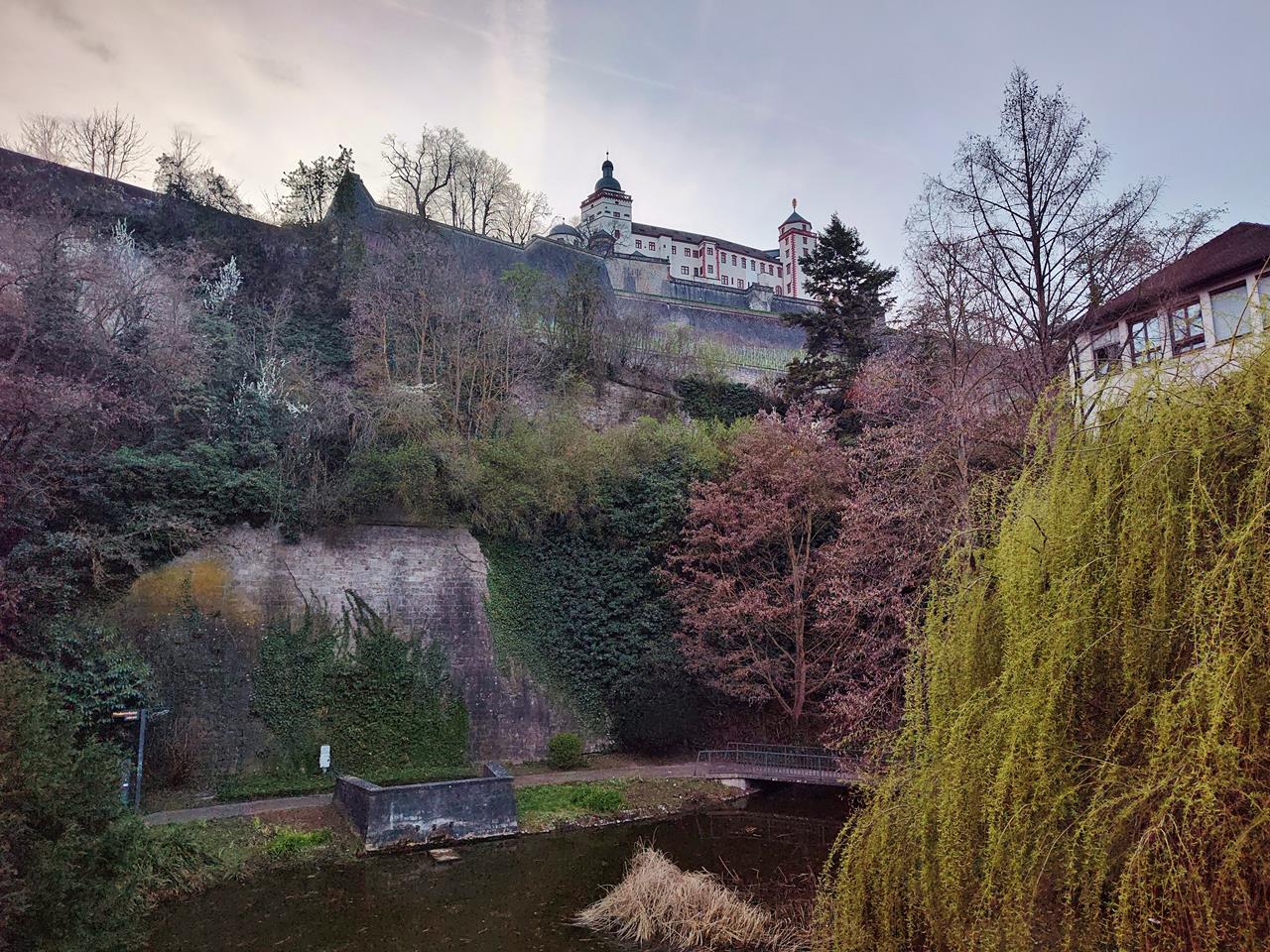 Blick vom Mainwehr an der Alten Mainbrücke hinauf zur Festung