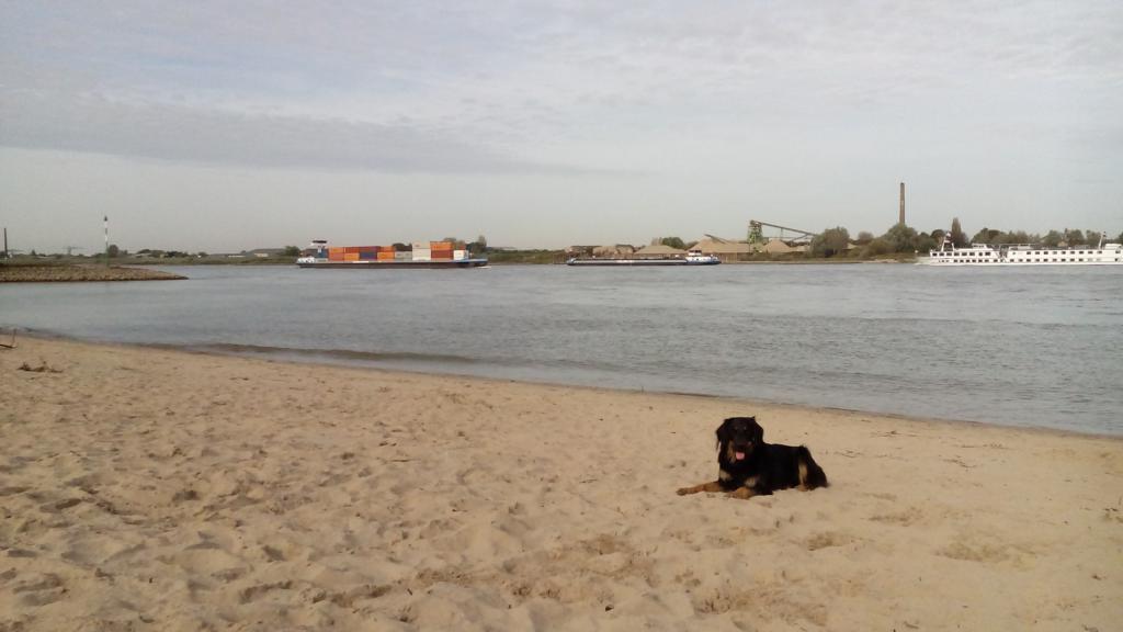 Am Ufer angelangt, dann eine Überraschung: Der Rhein ist hier bereits deutlich breiter als in der Region Düsseldorf/Köln. Und er wirkt industrieller. Aber irgendwie auch weitläufiger und leerer. Sehr interessant. Hier kommen wir bestimmt noch einmal hin.