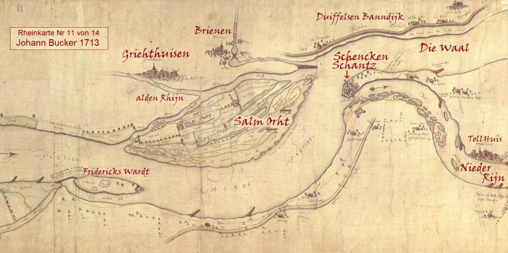 Bis zu Wasserbaumaßnahmen Anfang des 18. Jahrhunderts lag der Ort am strategisch wichtigen Trennpunkt des Rheins in Waal und Niederrijn.