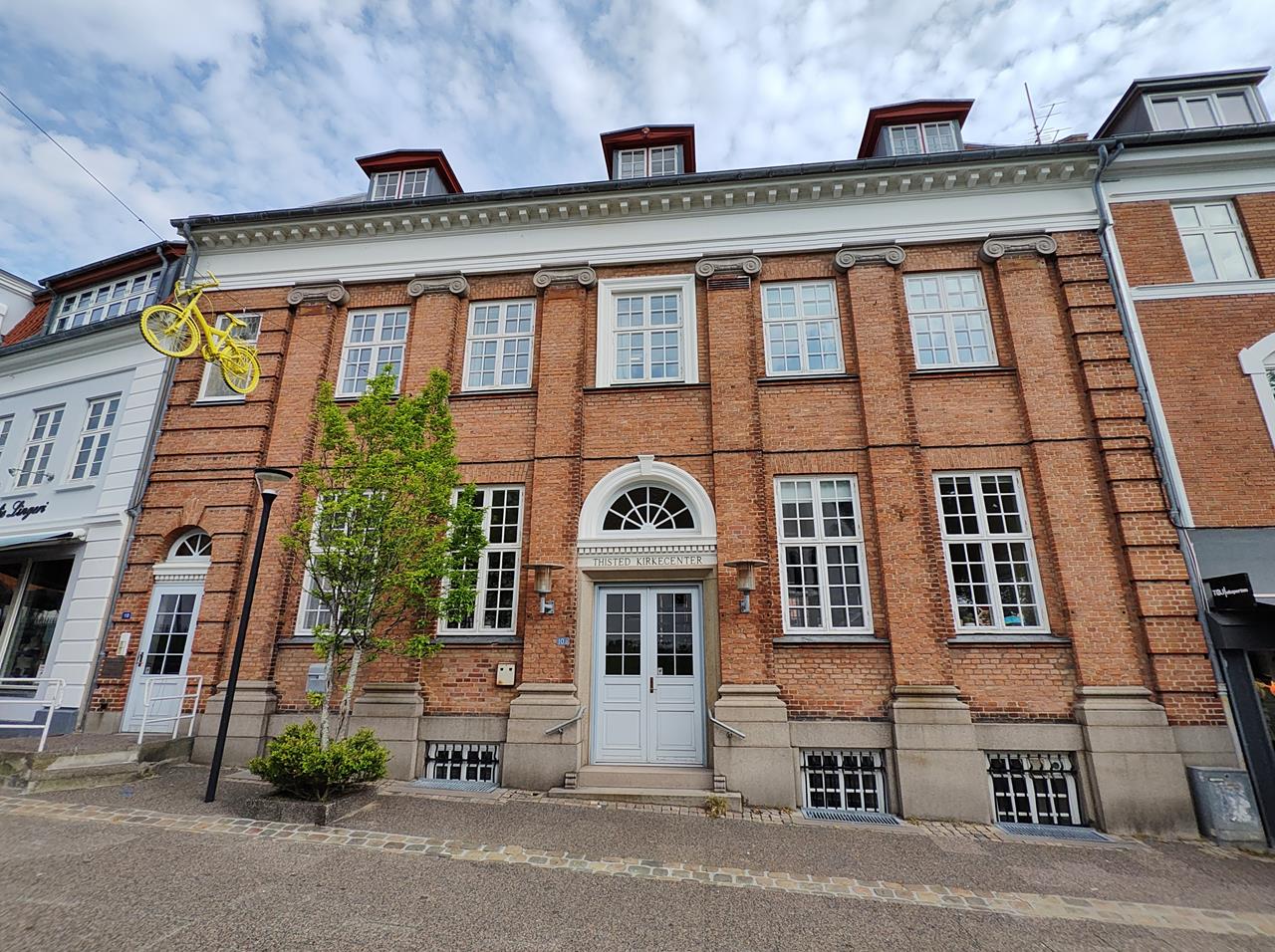 Da wir nun schon einige Kleinstädte in Jütland besucht haben, ist Thiste keine besonders große Überraschung für uns. Markant allerdings die vielen gelb gestrichenen Fahrräder, die in der langgezogenen Einkaufstraße in der Luft schweben.