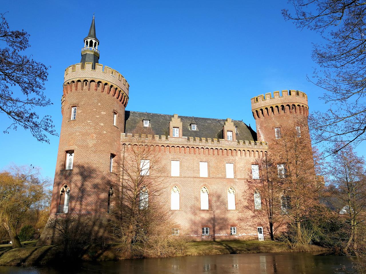 Der Name des Wasserschlosses bei Bedburg-Hau im Kreis Kleve leitet sich von den niederländischen Worten „mooi land“ ab, die „schönes Land“ bedeuten. Das Schloss zählt zu den wichtigsten neugotischen Bauten in Nordrhein-Westfalen.