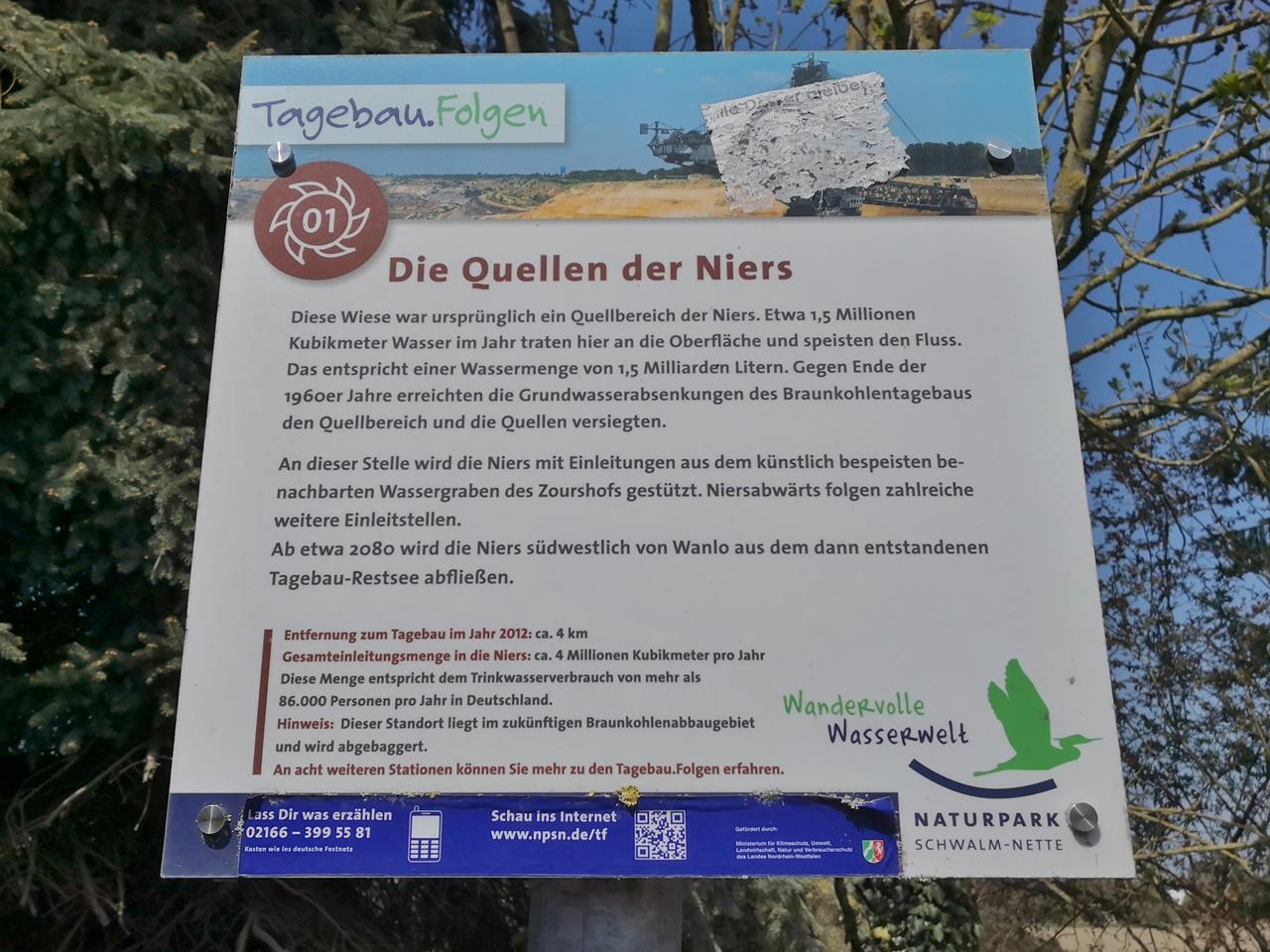 Die Niers fließt unter anderem durch Rheydt, Mönchengladbach, Wachtendonk, Geldern und Goch, um hinter Gennep in der niederländischen Provinz Limburg in die Maas zu münden. Das Einzugsgebiet umfasst rund 1.400 Quadratkilometer und wird von 750.000 Menschen bewohnt.Die Wanderung führte uns größtenteils durch schöne Auenlandschaften entlang der Niers, deren Oberlauf durch den angrenzenden Braunkohle-Tagebau Garzweiler längst trocken gefallen wäre. Denn für den offenen Kohleabbau in bis zu 150 Meter Tiefe muss das Grundwasser in der Region weiträumig abgepumpt werden, damit der Tagebau nicht voll läuft.