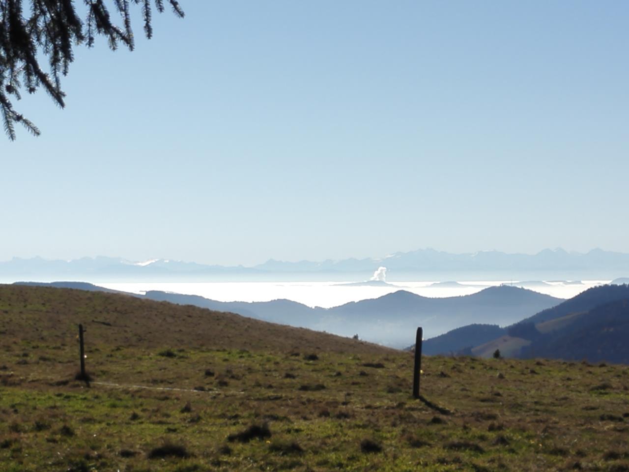 Im Hintergrund die Schweizer Alpen, dazwischen Nebel in den Niederungen