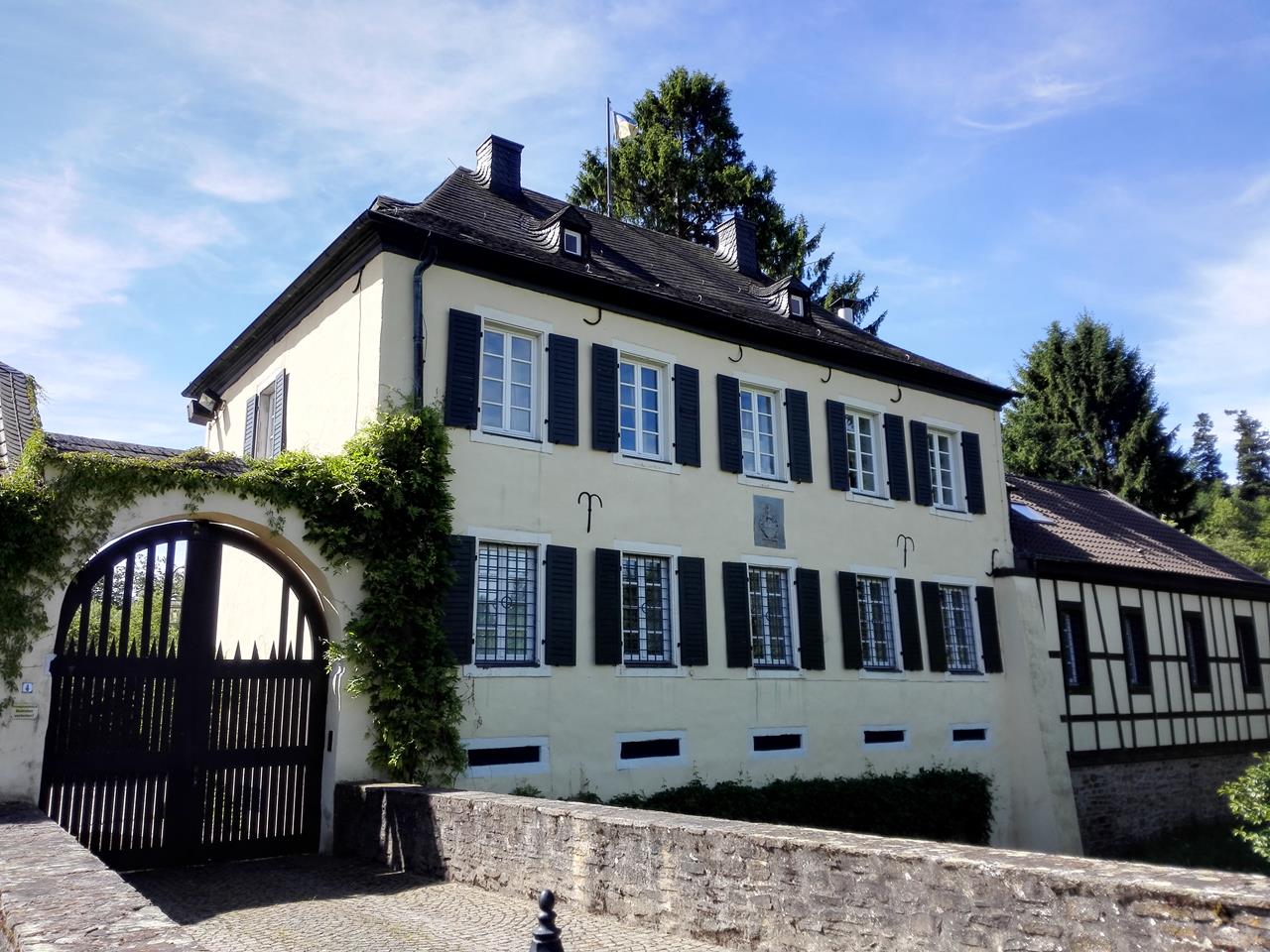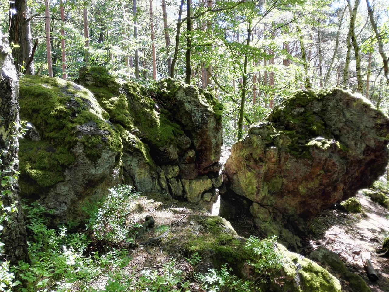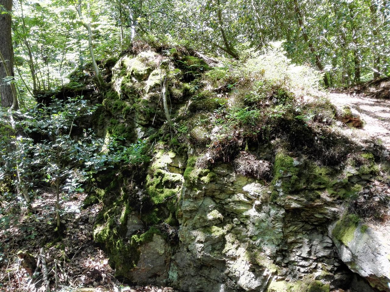 Auf einer rustikalen Holzbrücke queren wir den Bach und wandern anschließend über Vennsteige steil bergan zum Naturfreundehaus, einem Schullandheim, in dem an diesem Wochenende ein Kindergarten mit Eltern, Kindern und Betreuern zu Gast ist. Wir durchqueren den Ort Berg und treffen am Ortsrand wieder auf den Naturfreundeweg.Durch den Wald geht es weiter nach Todenfeld, wo wir einen herrlichen Fernblick hinüber ins Siebengebirge und bis nach Köln genießen. Hinter Todenfeld erreichen wir wieder den schattigen Wald. Dort unternehmen wir einen kleinen Abstecher zu den markanten „Eisensteinen“ und den moosbewachsenen „Grünen Steinen“.