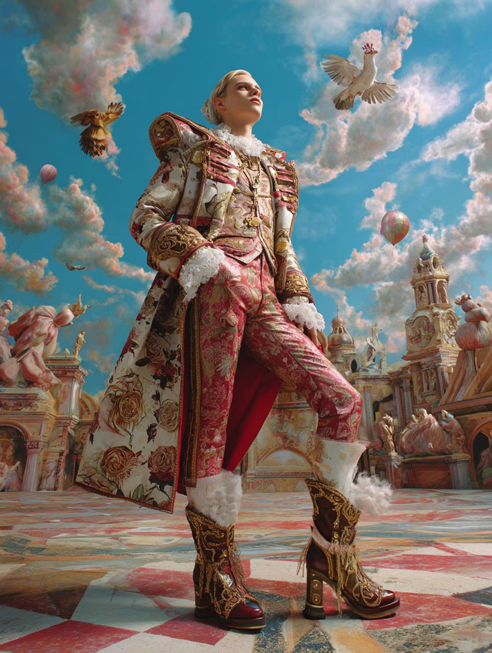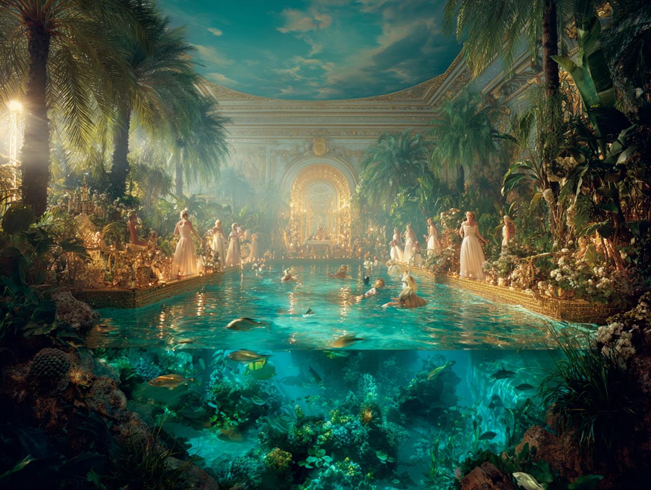 Neu aus der KI auf meiner Festplatte: Frisch imaginierte Fotografien im Stile von David LaChapelle (*1963), einem vielfach ausgezeichneten amerikanischen Fotografen und Regisseur, insbesondere von Musikvideos.