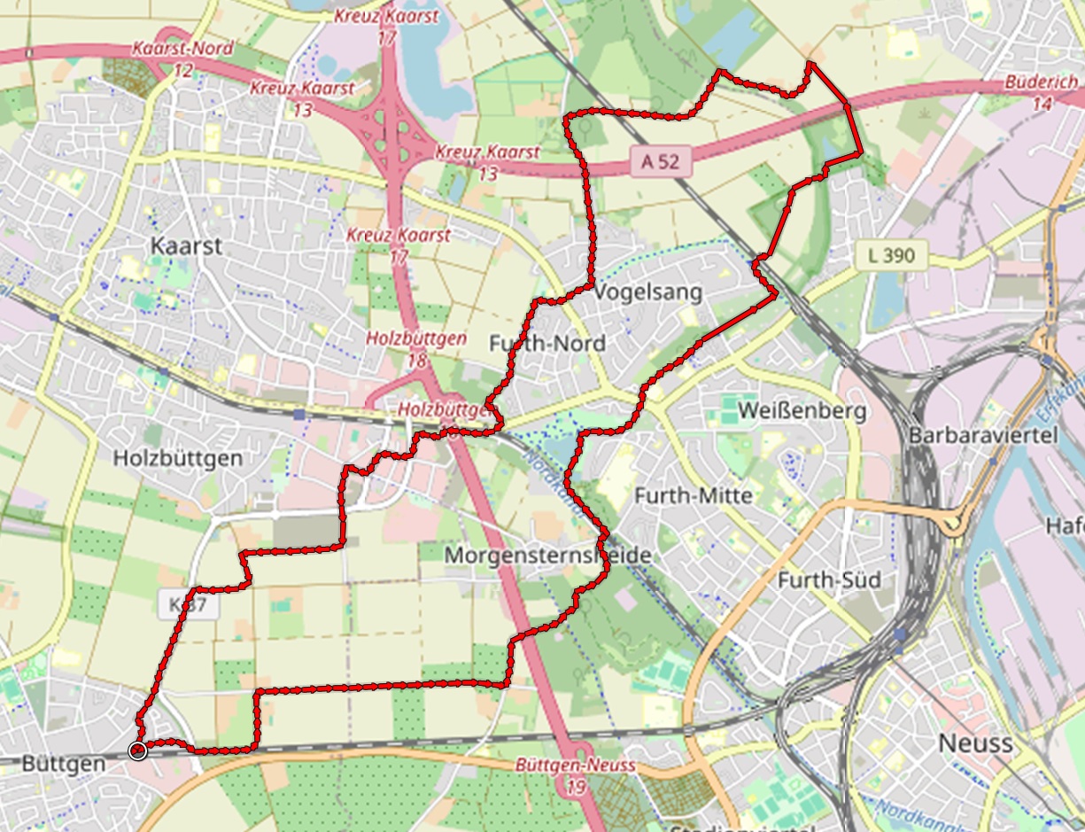 Heute bin ich eine lange Freestlye-Runde von meinem Heimatort über den Neusser Norden bis zum Rand von Meerbusch-Büderich gewandert – 17,5 km hin und zurück in etwas mehr als drei Stunden.